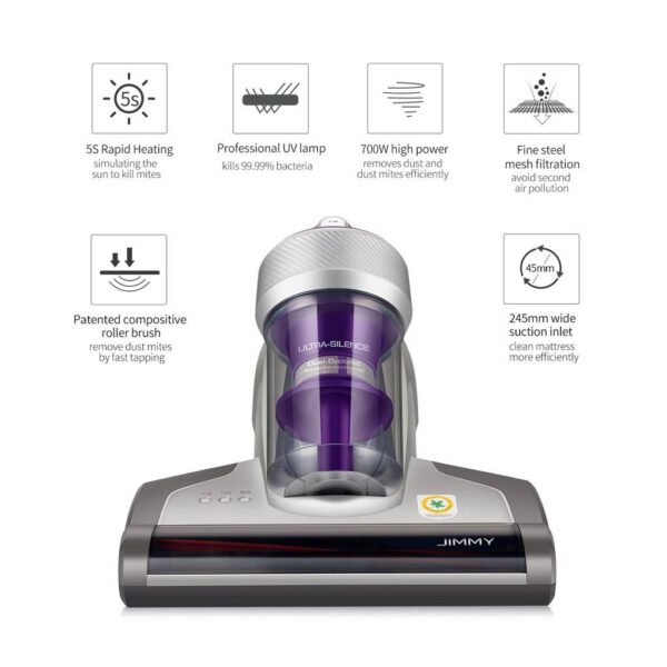 [สเปคสินค้า] Voltage:220-240V Power:700W Power Lenght:5m UV Light Power:6W Motor: Double Working Noise: <68dB Dust Cup Capacity:0.5L With hot air function Hot wind Temperature: 60°C Carton Size:414*316*270mm Machine Size:366*281*223mm Gross Weight:3.7kg Net Weight:2.6kg Roller brush type: Soft rubber strip & antistatic fiber competitive roller brush ● ยี่ห้อ : JIMMY ● รุ่น : JV35 ● วัสดุ : Metallic Spray ● ประเภทเครื่อง : เครื่องดูดฝุ่น ● กำลังไฟ : 700W ● แรงดันไฟ : 220V-240V ● กำลังดูด : มากกว่า 14,000Pa ● น้ำหนักสินค้า : 2.6 กก. ● สายไฟยาว : 5 เมตร JIMMY JV35 กำลังดูดสูง ไม่ทำร้ายเนื้อผ้า ● ใช้ระบบ Ultra Silence ให้ความเงียบเพิ่มขึ้น ● อัตราดูดไรฝุ่น 99.9 % กำจัดไรฝุ่น ● Motor รุ่นใหม่ ที่ดีกว่า ทนทาน มีประสิทธิภาพมากกว่า ● Allergy UK Seal Of Approval ได้รับการรับรอง สามารถกำจัดสารที่ก่อให้เกิดภูมิแพ้ ● การฆ่าเชื้อ UV ด้วยคลื่น 253.7nm เพื่อขจัดไรฝุ่นได้อย่างมีประสิทธิภาพ ● ความจุถ้วยเก็บฝุ่น 0.5 ลิตร ถอดออกมาล้างทำความสะอาดได้ ● ใช้แปรงลูกกลิ้งคอมโพสิต (เป็นวัสดุผสม เป็นได้ทั้งพลาสติกและโลหะ มีความแข็งแรงเป็นพิเศษ) ● มีความถี่ และแรงสั่นสะเทือนสูง เพื่อดึงไรฝุ่นที่ฝังอยู่ลึกขึ้นมาได้ ● ใช้เทคโนโลยี อัจฉริยะ เพื่อป้องกันการรั่วไหลของรังสียูวี ● หัวแปรงมีเส้นผ่านศูนย์กลาง ขนาด 45 มม. ประกอบไปด้วยแถบแปรงยางแบบนิ่ม และแปรงขนแบบอ่อน ● ใช้เทคโนโลยีการกรองฝุ่นแบบทอร์นาโด ● หัวแปรงกว้าง 24.5 เซ็นติเมตร กำลังดูด 700W สามารถทำความสะอาดเตียงนอน 1.8 เมตร ได้ ใน 3 นาที